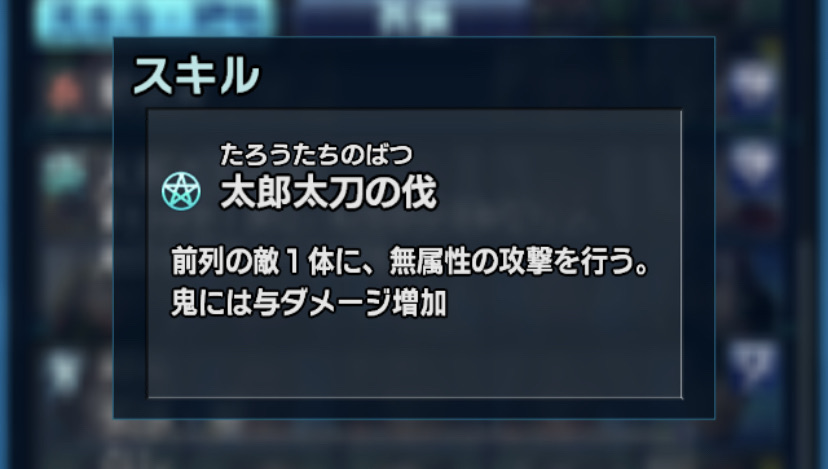 ちなみにスキルの欄で紹介したように旧種族(鬼・屍・獣)に対しては安定した火力が出せるため、屍の黄泉渡しはもちろん、獣の鎧蠍系、鬼の石魔鬼系に対しても有効ですし、さらには物理術耐性20%を持つ神に対しても安定したダメージが出せます。(あとわさび・・・)